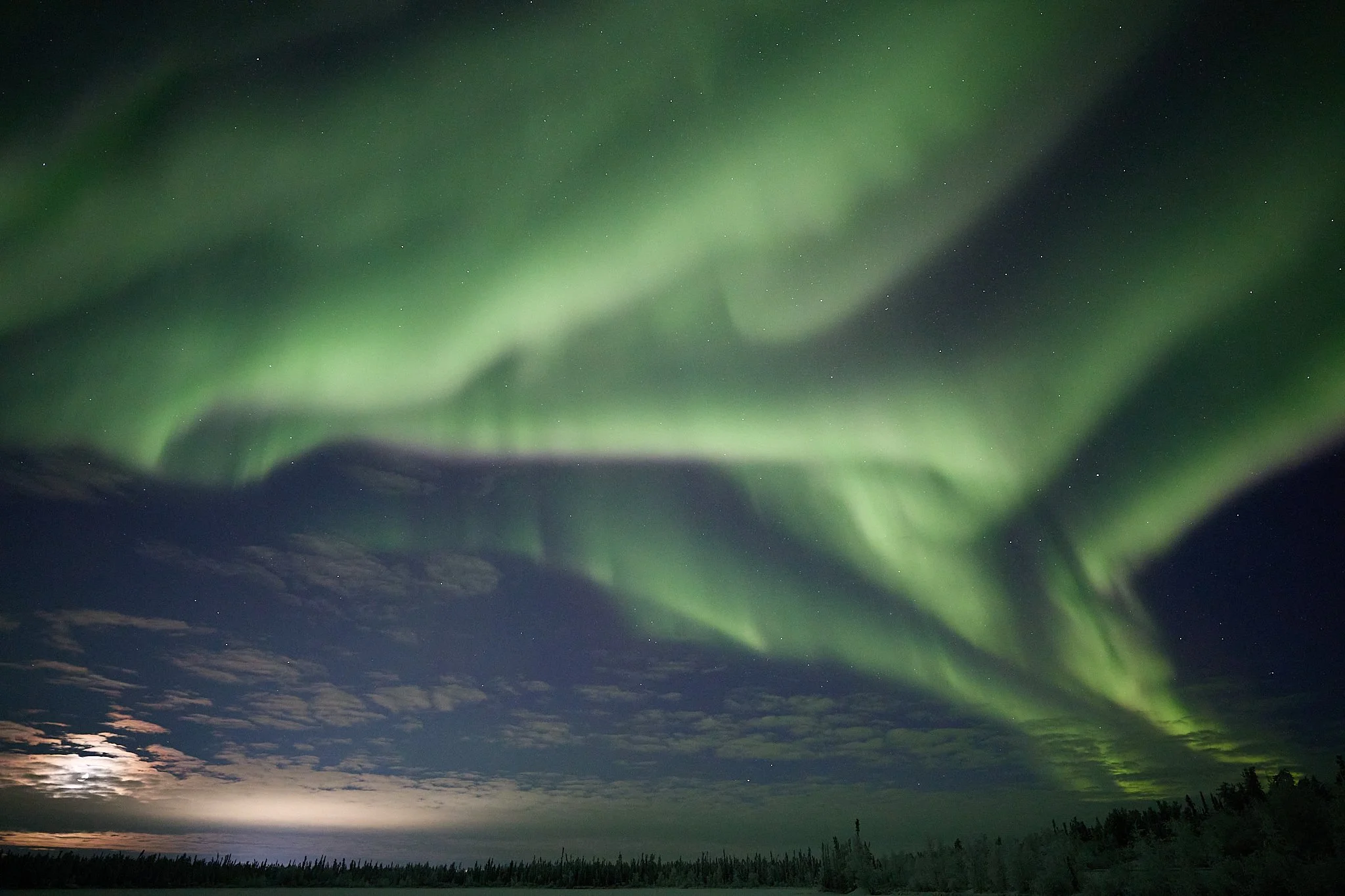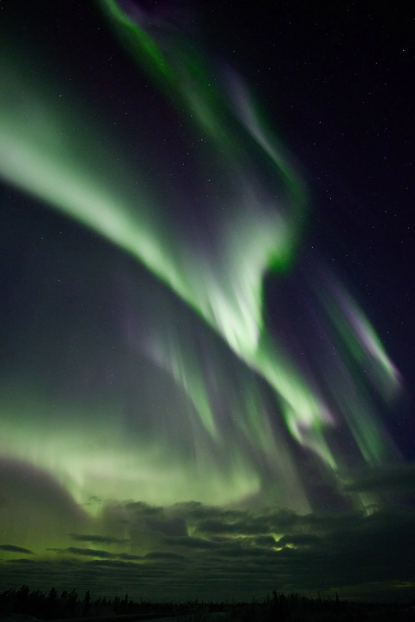 Not wanting to overplay our hand by running far out in the east, we did stay closer to Yellowknife at first. The clouds were, in classic October fashion, very low and fast moving carrying a lot of light pollution from town - problematic while we were seeing very quiet auroral conditions. Even still, some visible aurora came and went between the clouds at various stops.